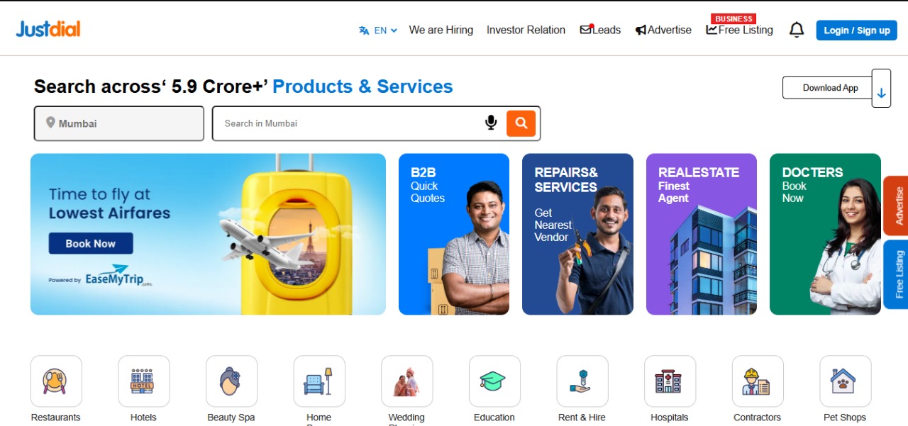 A clone of Justdial homepage created with HTML, CSS, JS, and Bootstrap. Focused on responsive layout and modern UI.